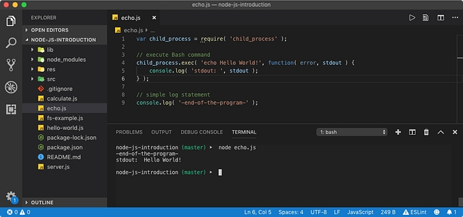 If you make Node.js your life and want to do everything from Node, then this topic is very important. Let's say that from a JavaScript program, you want to execute a BASH command. A Bash command would be echo Hello World!