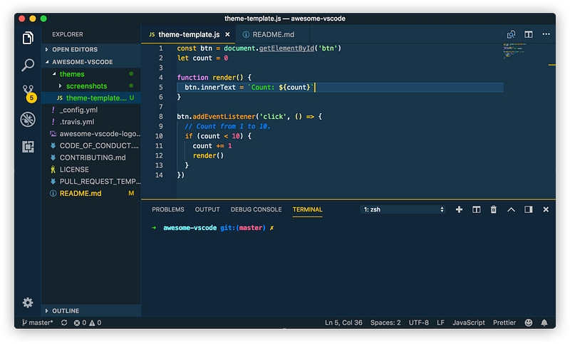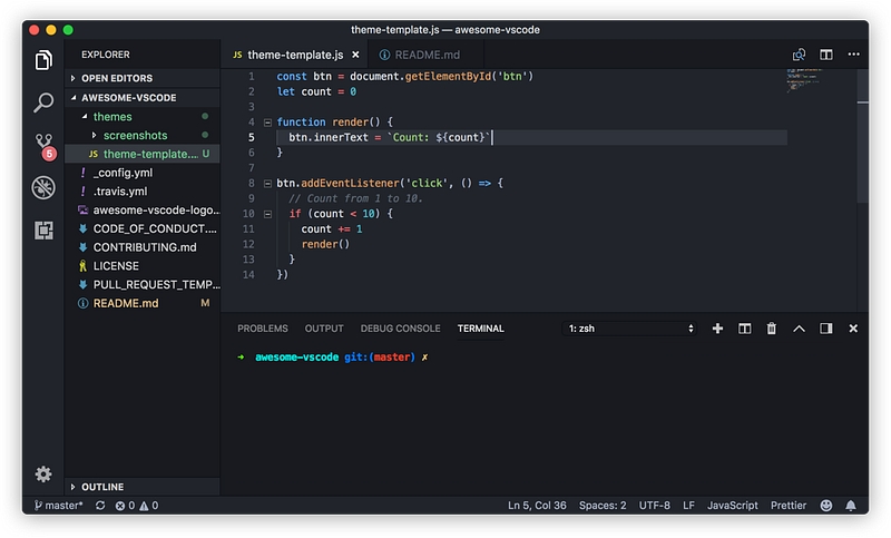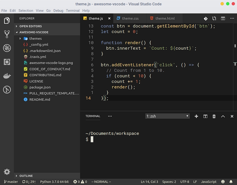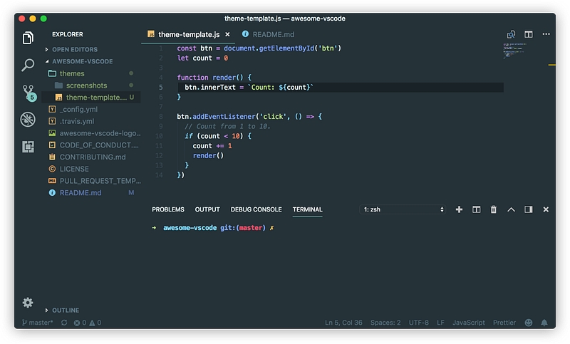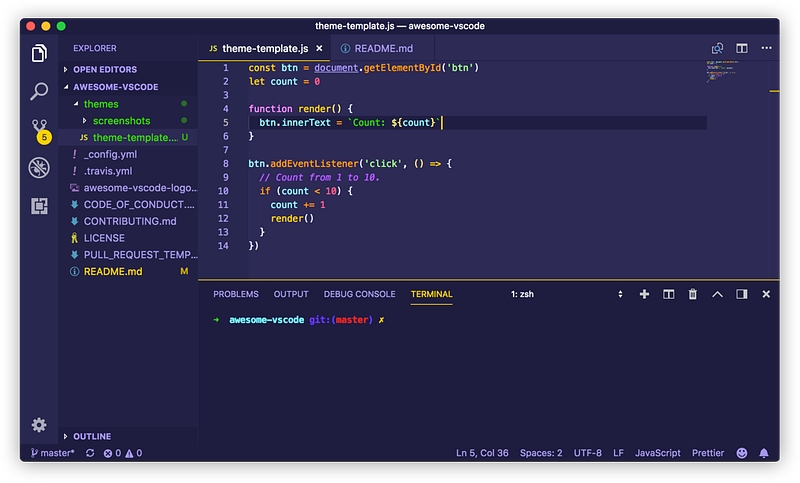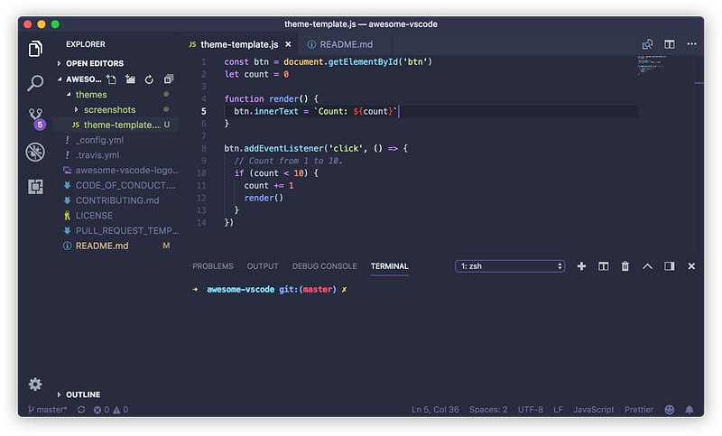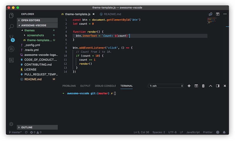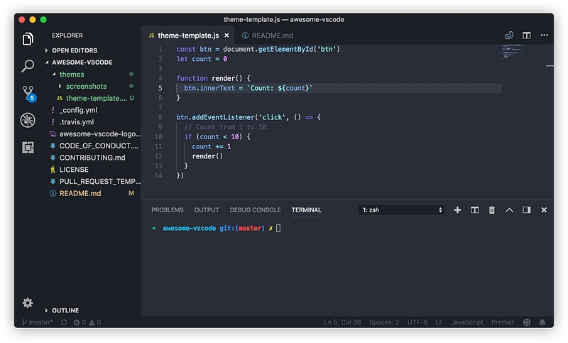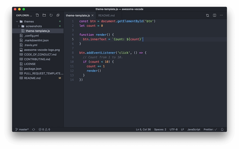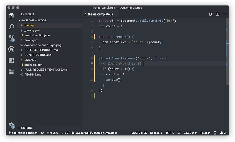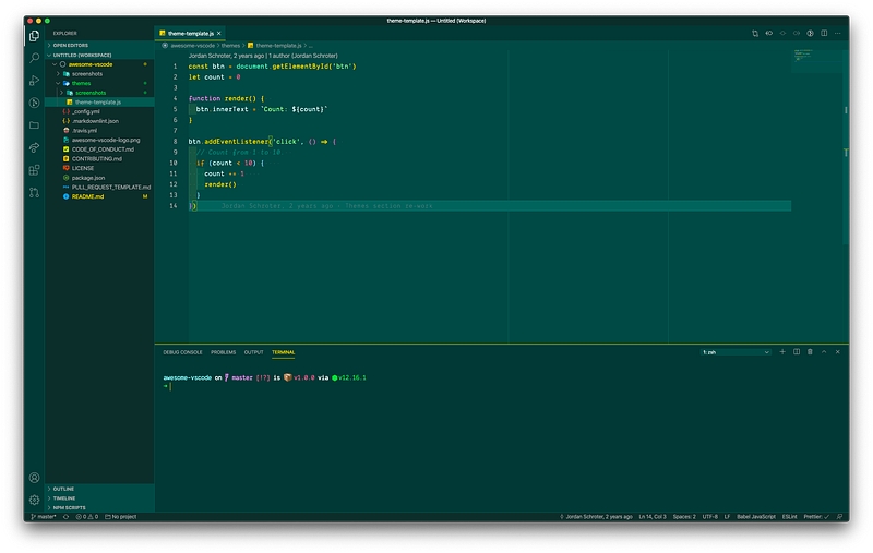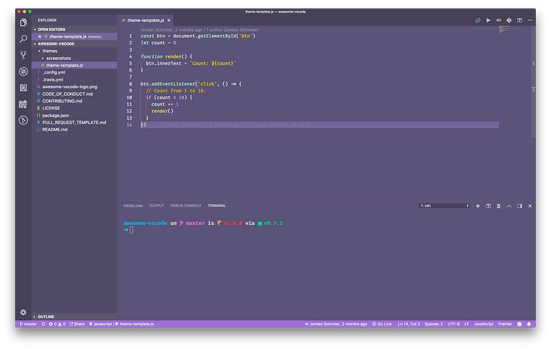 A VS Code theme for the night owls out there. Works well in the daytime, too, but this theme is fine-tuned for those of us who like to code late into the night. Color choices have taken into consideration what is accessible to people with color blindness and in low-light circumstances. Decisions were also based on meaningful contrast for reading comprehension and for optimal razzle dazzle. ✨