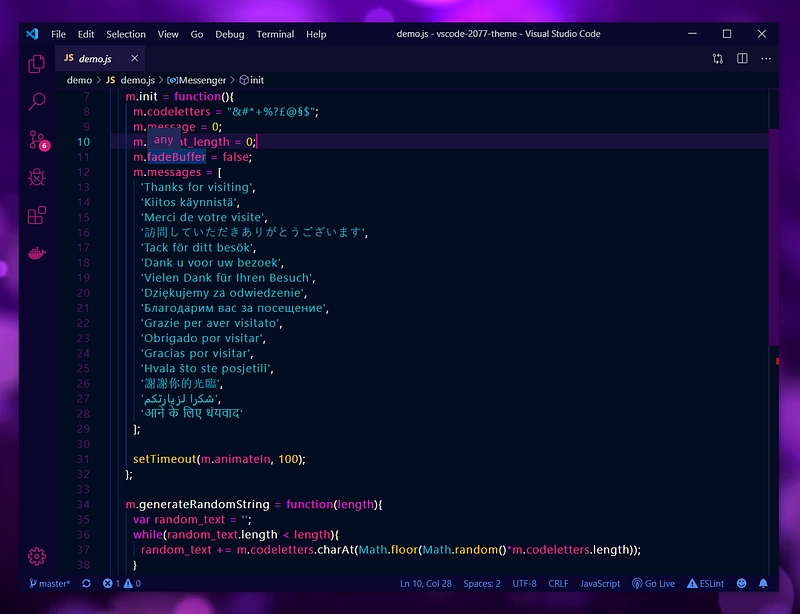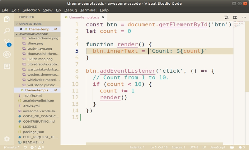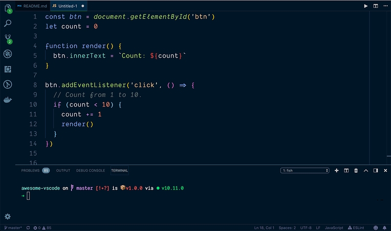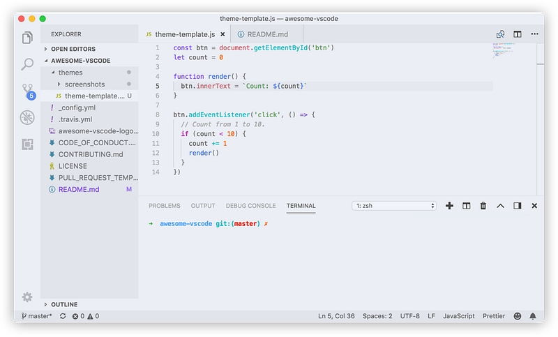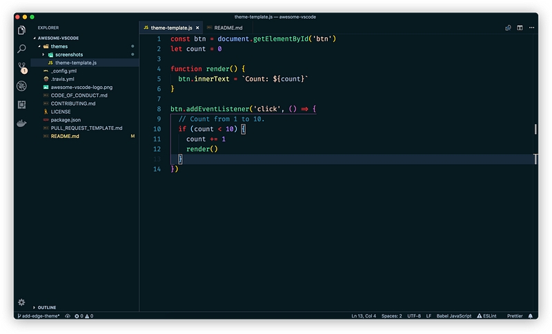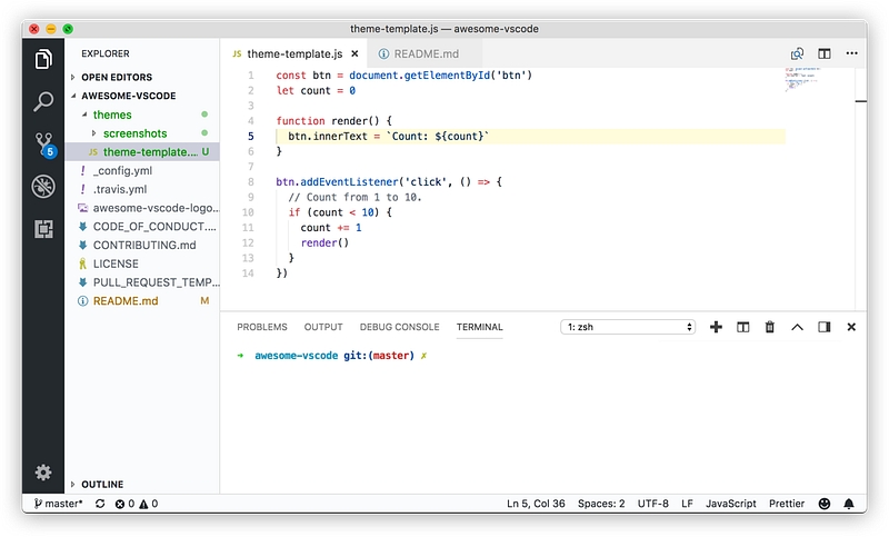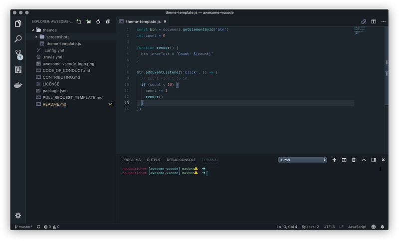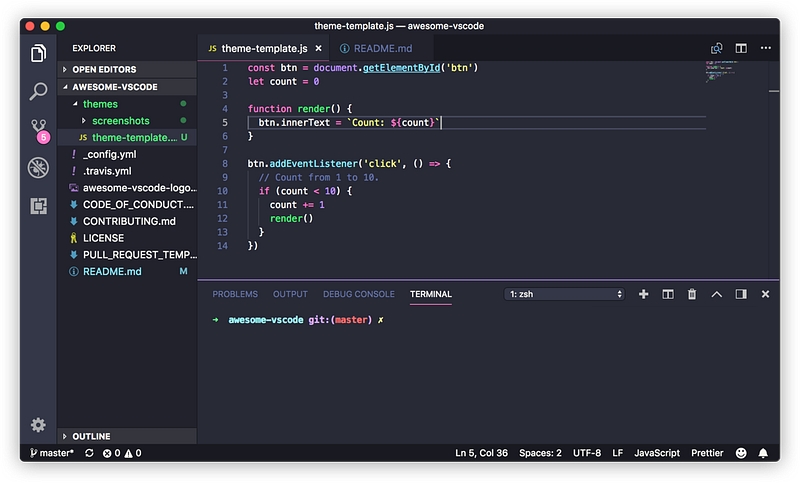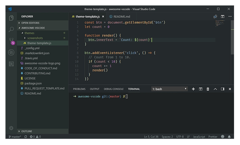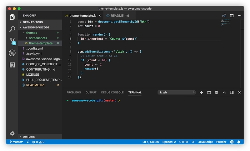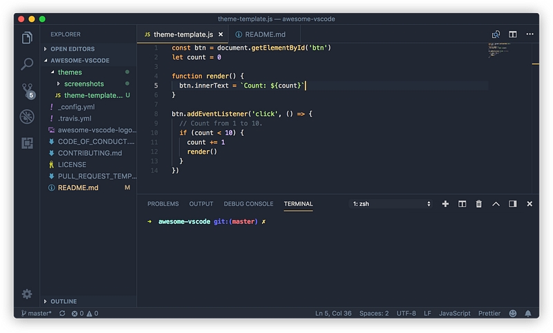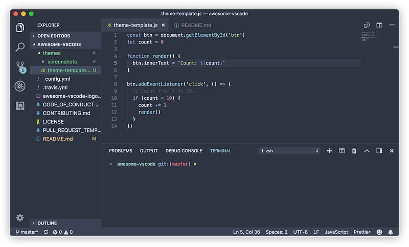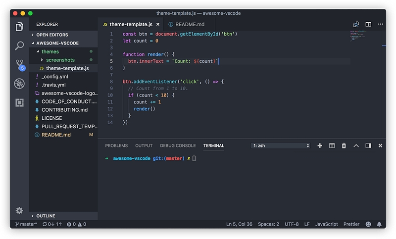 A VS Code theme for the night owls out there. Works well in the daytime, too, but this theme is fine-tuned for those of us who like to code late into the night. Color choices have taken into consideration what is accessible to people with color blindness and in low-light circumstances. Decisions were also based on meaningful contrast for reading comprehension and for optimal razzle dazzle. ✨