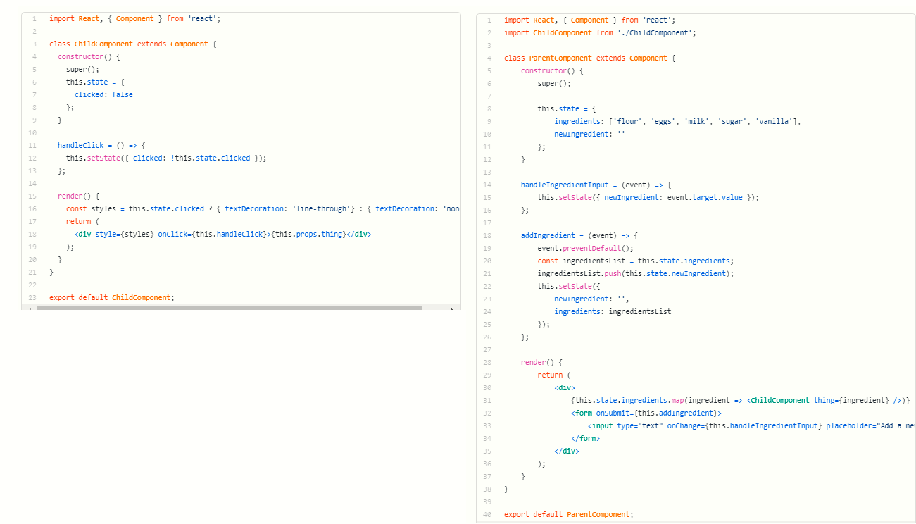 This new syntax is what is often referred to as 'syntactic sugar': under the hood, the React library translates this back into the old constructor code that we first started with, so that the JavaScript remains valid to the JavaScript interpreter.
