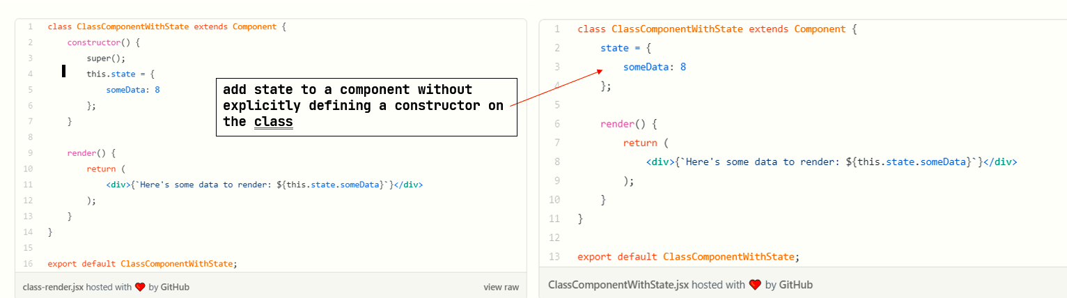 With Reacts newest version, we can actually now add state to a component without explicitly defining a constructor on the class. We can refactor our class component to look like this: