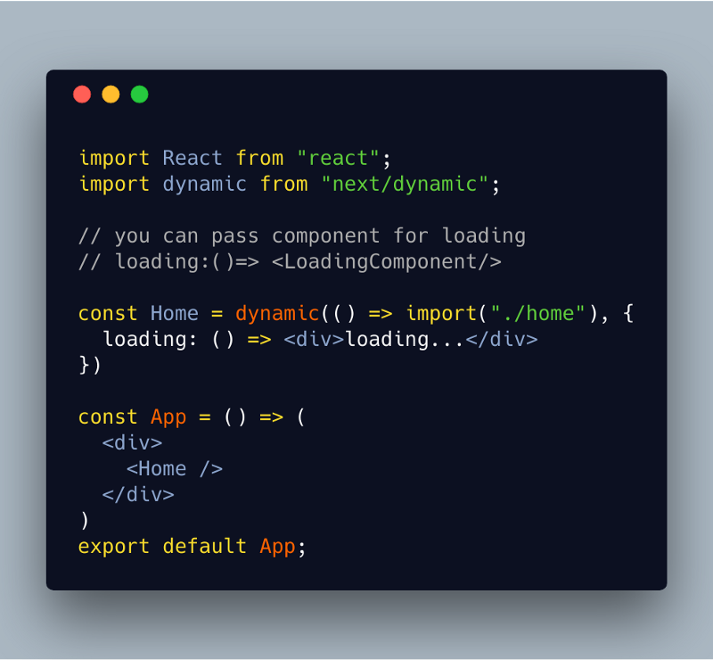 Next.js comes with its own code splitting method. It provides us a method, called dynamic, to load our component, as in the example below: