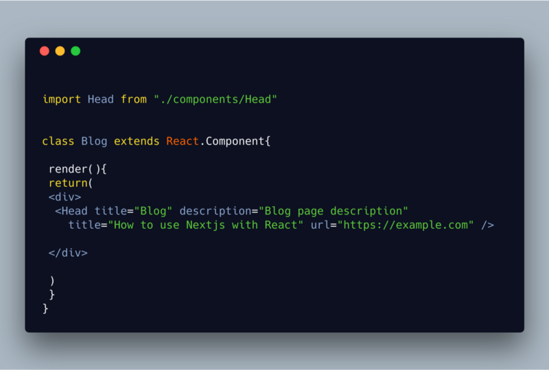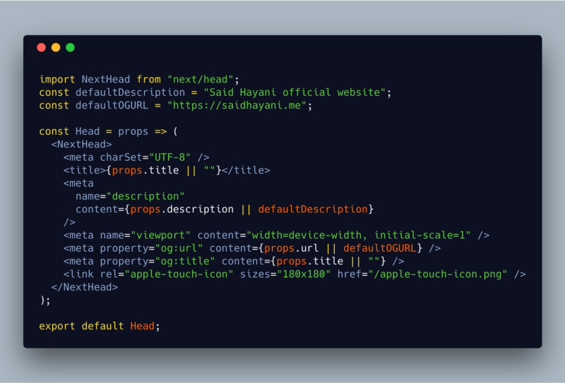 Speaking of search engine optimization, Next.js comes with a Head component that allows you to add and make dynamic meta tags. It’s my favorite feature — you can make custom and dynamic meta tags. These make your website able to be indexed by search engines like Google. Here is an example of a Head component :