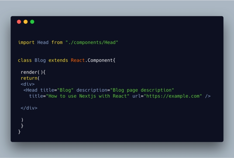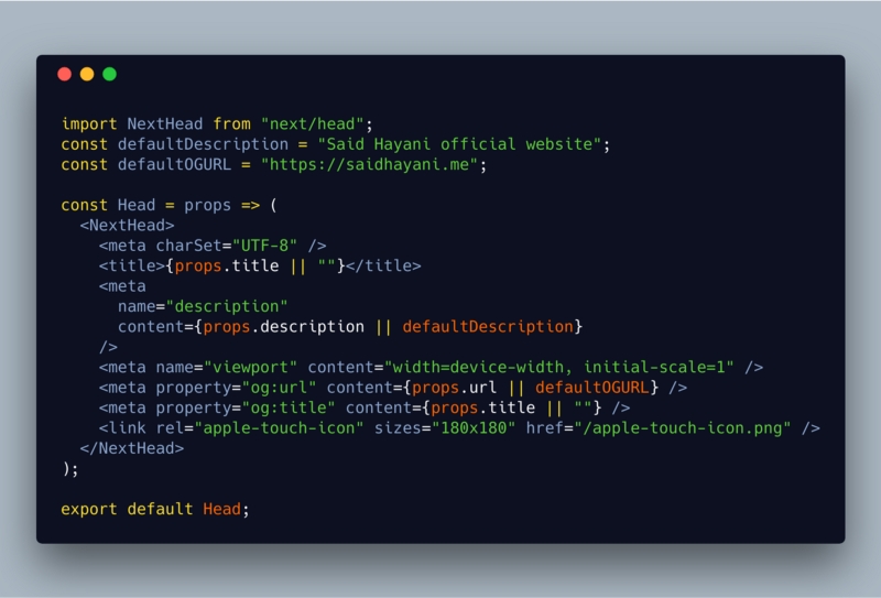 component that allows you to add and make dynamic meta tags. It’s my favorite feature — you can make custom and dynamic meta tags. These make your website able to be indexed by search engines like Google. Here is an example of a Head