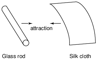 It was discovered centuries ago that certain types of materials would mysteriously attract one another after being rubbed together. For example: after rubbing a piece of silk against a piece of glass, the silk and glass would tend to stick together. Indeed, there was an attractive force that could be demonstrated even when the two materials were separated: