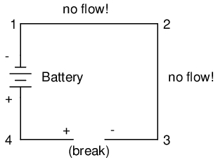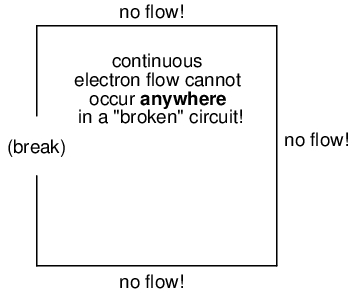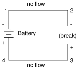 As before, with no flow of electrons, the entire potential (voltage) of the battery is available across the break, waiting for the opportunity of a connection to bridge across that break and permit electron flow again. This condition is known as an open circuit, where a break in the continuity of the circuit prevents current throughout. All it takes is a single break in continuity to "open" a circuit. Once any breaks have been connected once again and the continuity of the circuit re-established, it is known as a closed circuit.