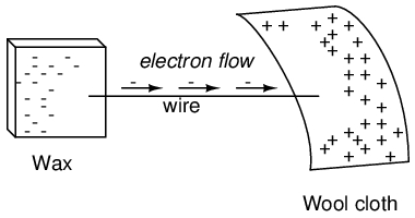 If a conductive wire is placed between the charged wax and wool, electrons will flow through it, as some of the excess electrons in the wax rush through the wire to get back to the wool, filling the deficiency of electrons there:
