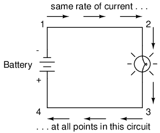Because electric current is composed of individual electrons flowing in unison through a conductor by moving along and pushing on the electrons ahead, just like marbles through a tube or water through a pipe, the amount of flow throughout a single circuit will be the same at any point. If we were to monitor a cross-section of the wire in a single circuit, counting the electrons flowing by, we would notice the exact same quantity per unit of time as in any other part of the circuit, regardless of conductor length or conductor diameter.