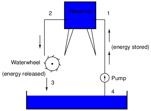It takes energy to pump that water from the low-level pond to the high-level reservoir, and the movement of water through the piping back down to its original level constitutes a releasing of energy stored from previous pumping.
