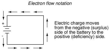 On a positive note (no pun intended), I have subsequently discovered that some students prefer electron flow notation when first learning about the behavior of semiconductive substances. Also, the habit of visualizing electrons flowing against the arrows of polarized device symbols isn't that difficult to learn, and in the end I've found that I can follow the operation of a circuit equally well using either mode of notation. Still, I sometimes wonder if it would all be much easier if we went back to the source of the confusion -- Ben Franklin's errant conjecture -- and fixed the problem there, calling electrons "positive" and protons "negative."Lessons In Electric Circuits -- Volume I